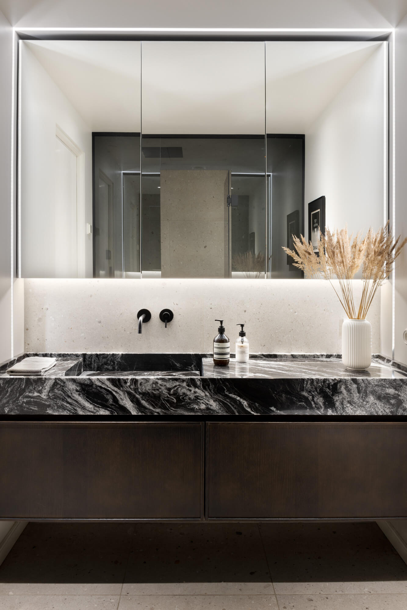 Nii köögi kui ka vannitubade kivipinnad teostas firma Kivisepad. Visuaalse puhtuse ja praktilisuse eesmärgil on kapid põrandalt lahti tõstetud.