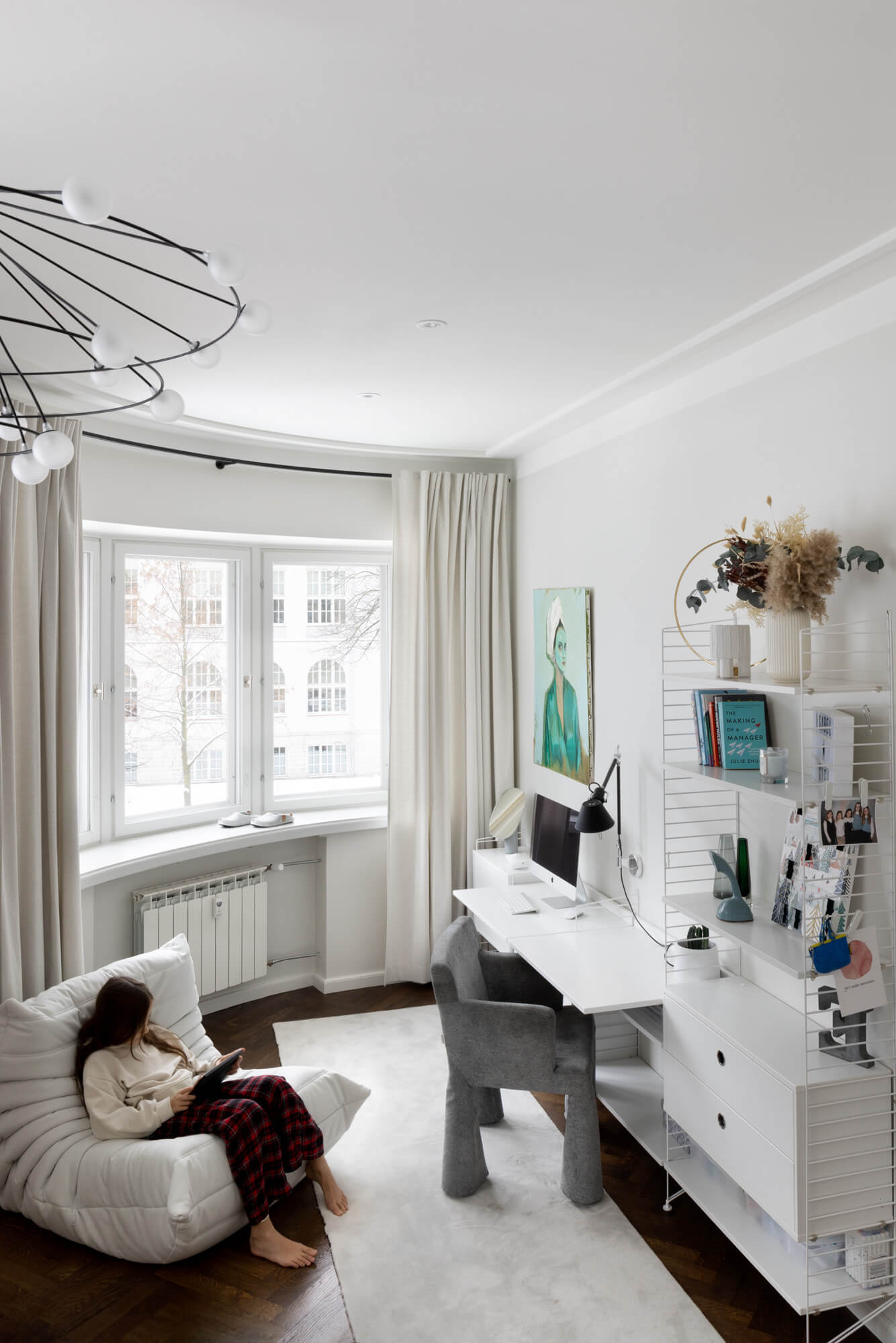 Tütre ümarnurgaga tuba on korteri kõige valgusküllasem ruum. Laes ripub Eesti tootja Seos Valgustus moodne lühter Inflore.
