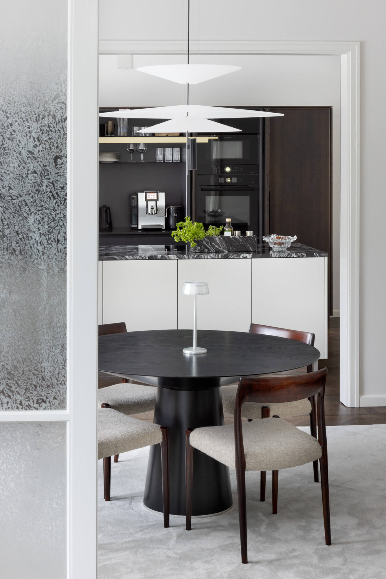 Endistviisi esinduslikult mõjuvad elu- ja söögituba eraldavad kõrged klaasitud lükanduksed. Et avara söögitoa pidulikkust rõhutada, lisas Joonas laele lihtsa profiiliga geomeetrilise karniisi. Selle puhul võttis disainerist peremees šnitti maja trepikojas säilinud laedetaililt. «Sageli ei pea kõike ise välja mõtlema, kui osata märgata, annab maja või ruum õiged võtted kätte,» lisab Joonas.
