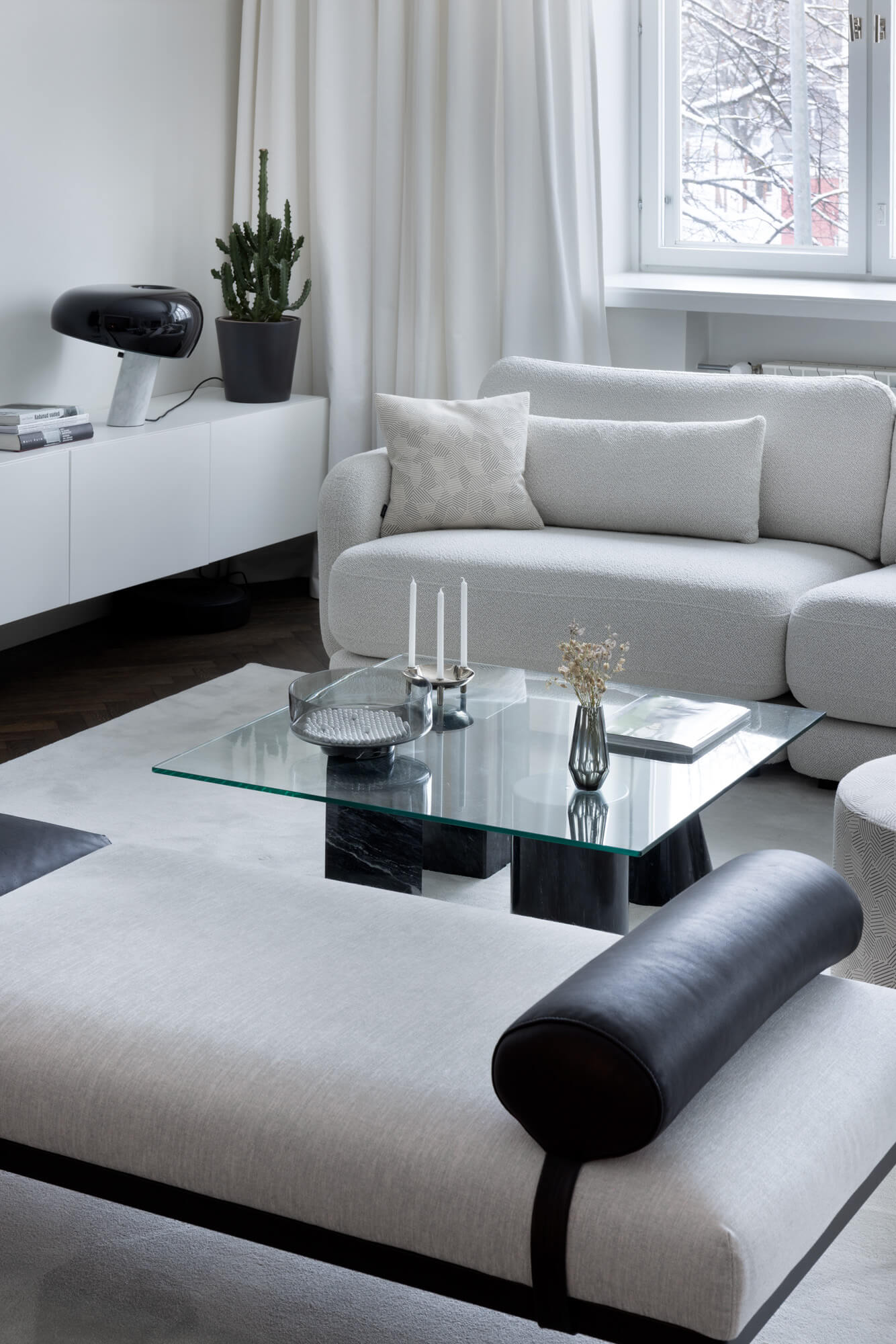 Tumedate põrandate ja valgete seintega monokroomsesse interjööri toovad elu valitud disainileiud reisidelt ning vintage-poodidest, värviline Murano klaas või põnev skulptuur. Küllap lisandub tulevikus veel mõni kunstiteos või disainirariteet – õiged asjad tulevad ajaga.