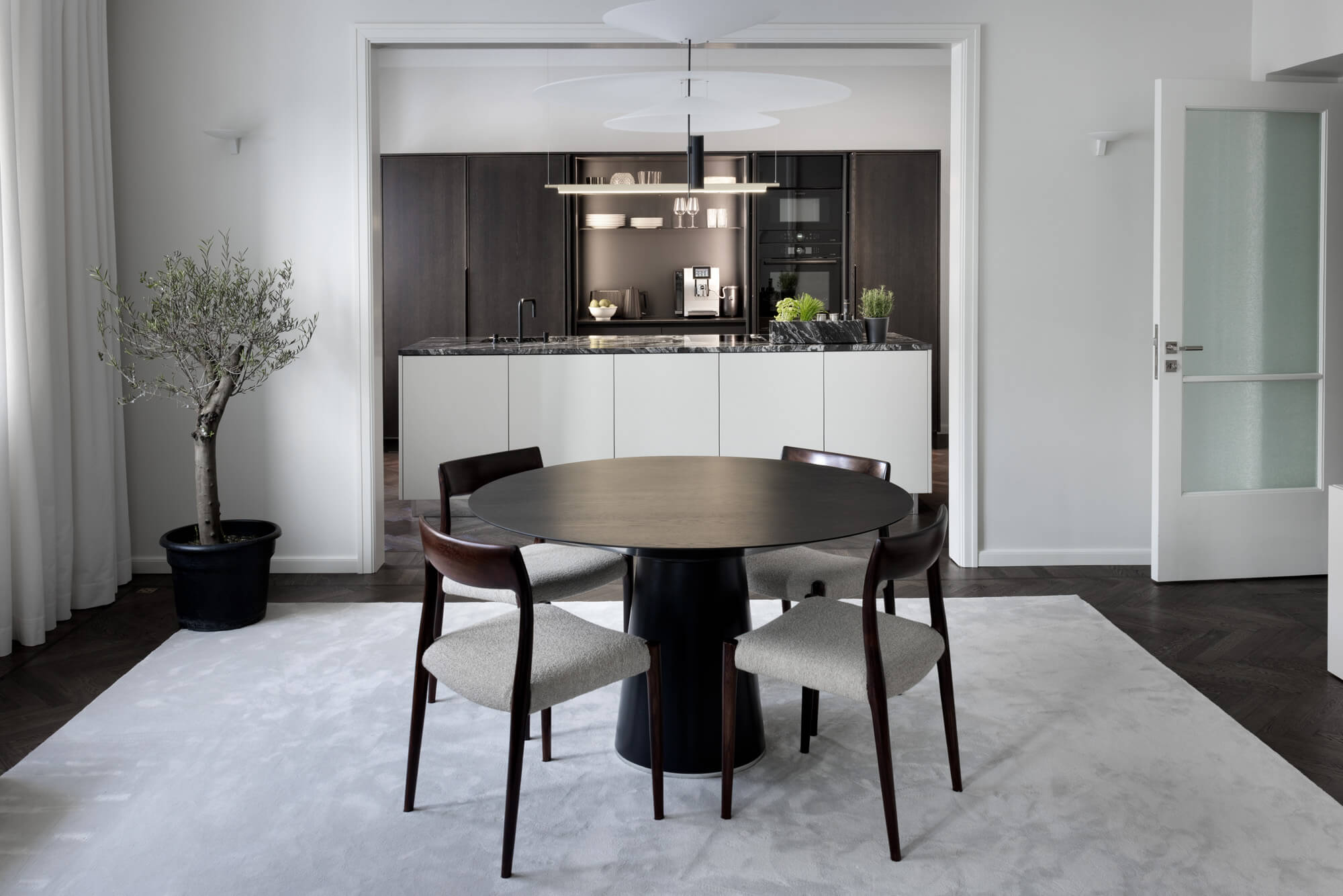 Söögitoas moodustavad kauni kompositsiooni Taani disainiklassikasse kuuluvad toolid, BoConcepti lauad ja nõtke Vibia valgusti Flamingo (Moodne Valgustus).