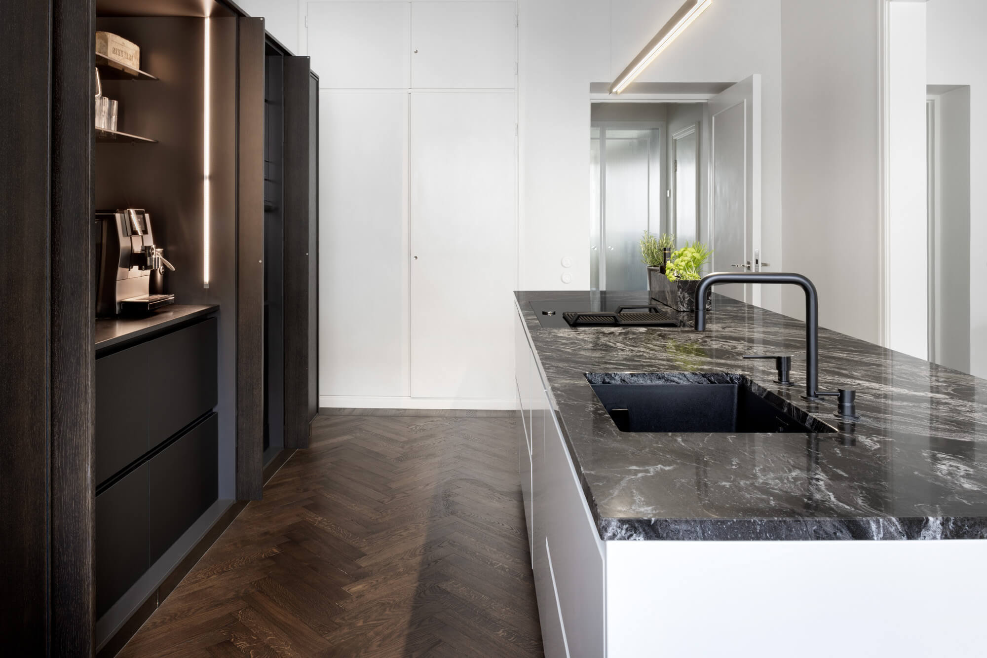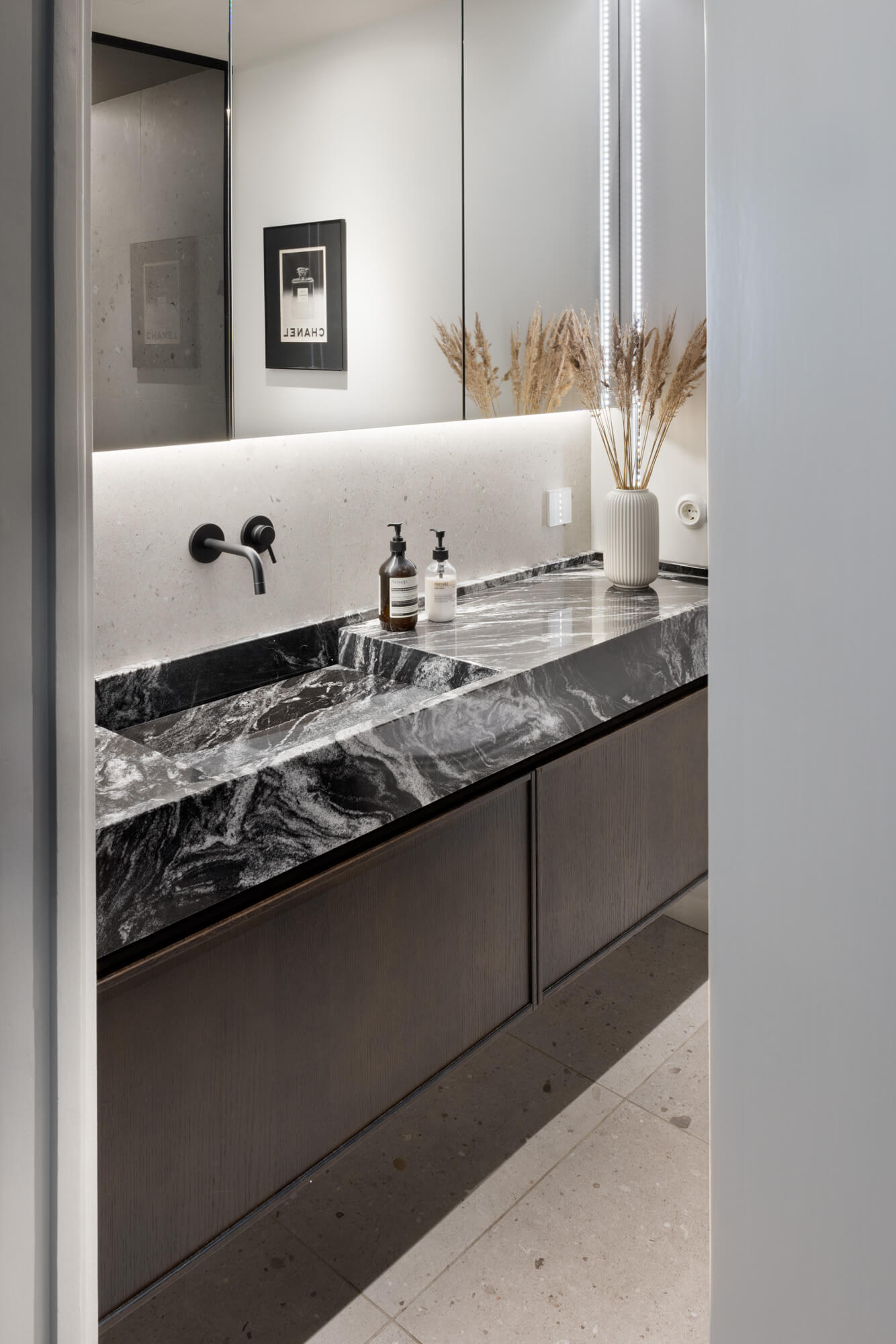 Nii köögi kui ka vannitubade kivipinnad teostas firma Kivisepad. Visuaalse puhtuse ja praktilisuse eesmärgil on kapid põrandalt lahti tõstetud.