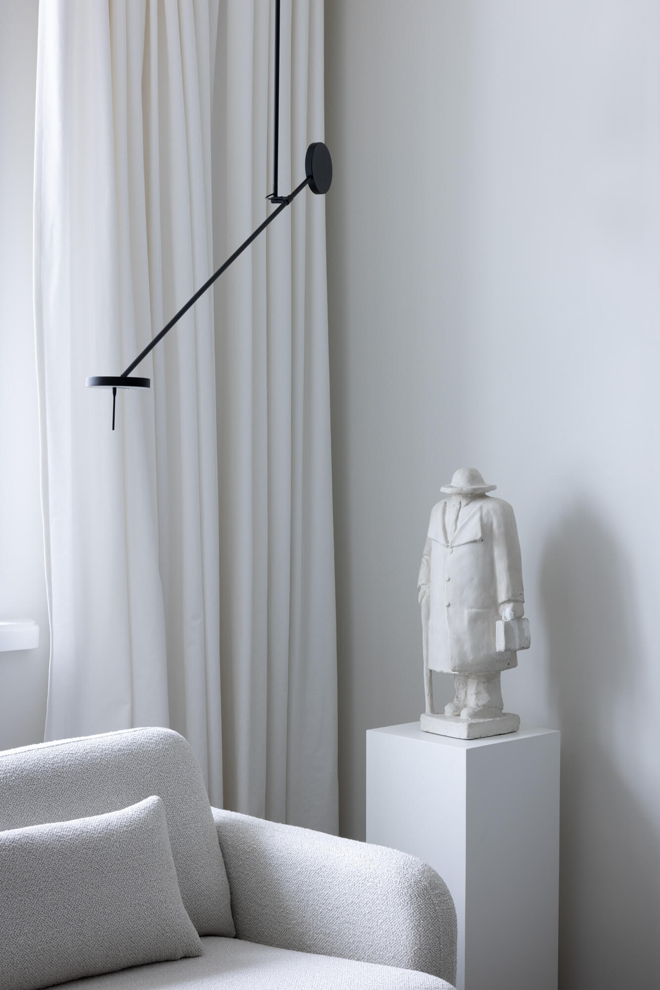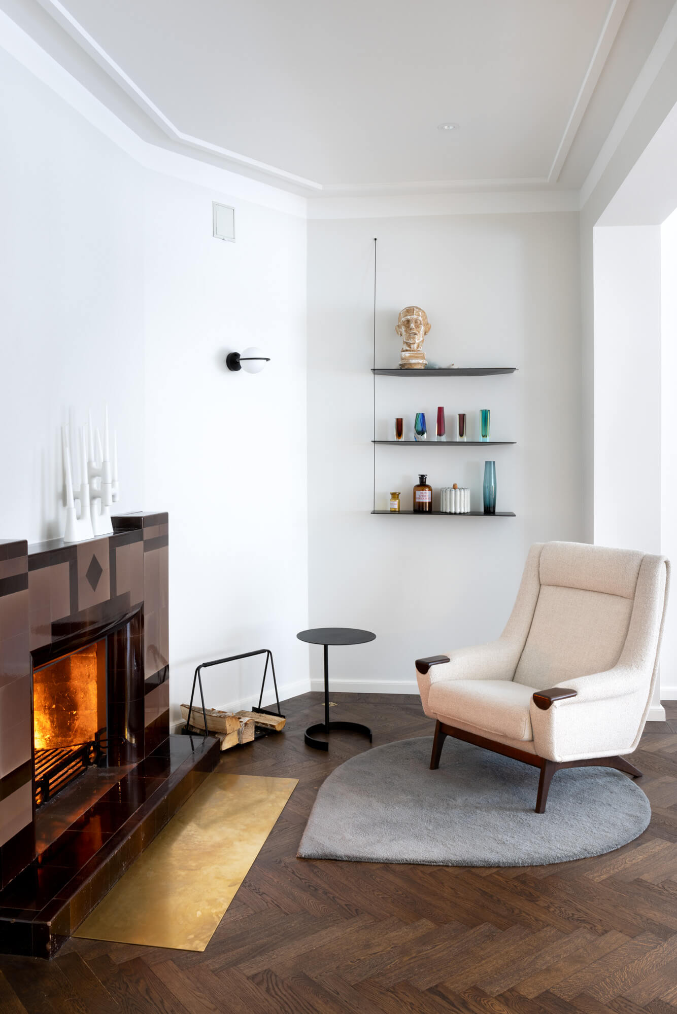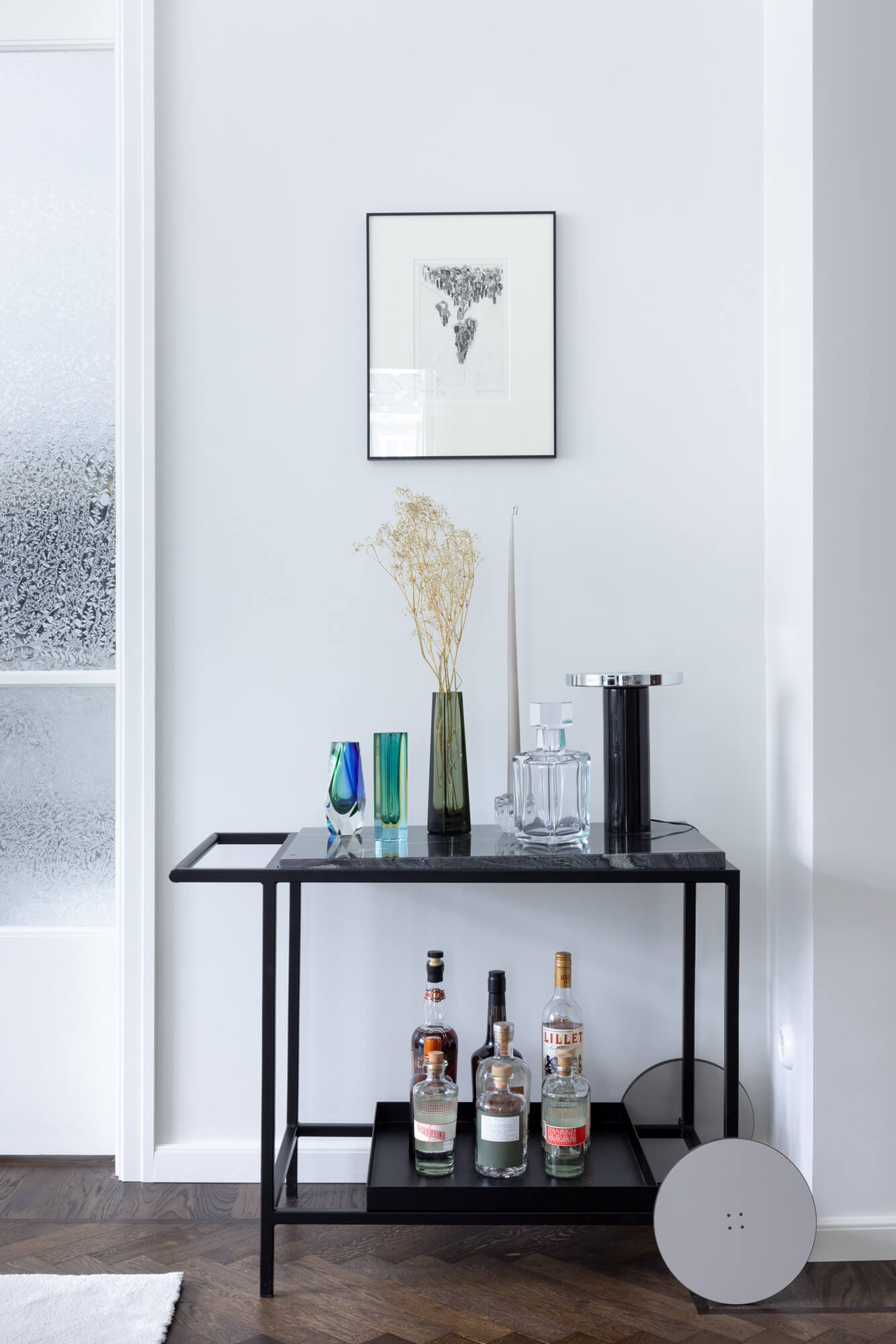 Tumedate põrandate ja valgete seintega monokroomsesse interjööri toovad elu valitud disainileiud reisidelt ning vintage-poodidest, värviline Murano klaas või põnev skulptuur. Küllap lisandub tulevikus veel mõni kunstiteos või disainirariteet – õiged asjad tulevad ajaga.
