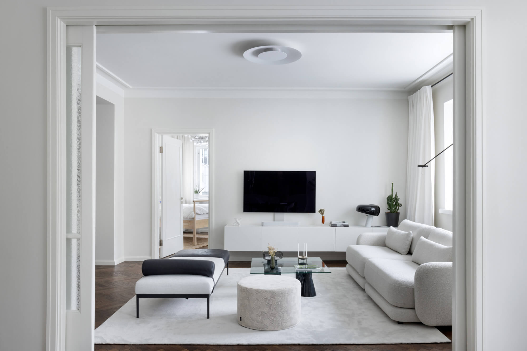Ehkki kolmekümnendate eksterjöörid olid juba funktsionalistlikult moodsad ja siledad, jõudis lihtsuse ja kerguse põhimõte tolleaegsetesse kodudesse üsna visalt. Endiselt pooldati mõneti raskepärast, traditsioonilise vormiga mööblit või ajaloolisi stiile. Ajaloolist vormi järgiva mööbli asemel on Joonas eelistanud oma kodu sisustades funktsionaalset, nappi ja selget joont. Tulemuseks on ajatu, moeülene ja klaar kujundus, kus moodne tippdisain sulandub nagu valatult ajaloolise hõnguga foonile. Minimalistlikud Toss B, Vibia ja Aromase valgustid aimavad oma vormis fungile omast lihtsust ja sirgust; valitud materjalid on väärikad ning kvaliteetsed.
